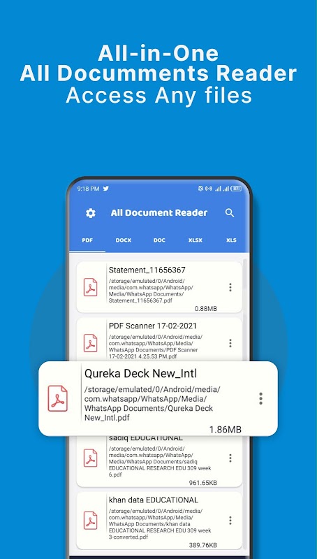 Apl Baca/Pelihat Semua Dokumen ialah alat serba boleh yang direka untuk membaca dan melihat pelbagai jenis dokumen. Apl ini menyokong pelbagai format fail, termasuk PDF, DOC, DOCX, PPT, PPTX, XLS, XLSX, TXT, RTF dan banyak lagi.