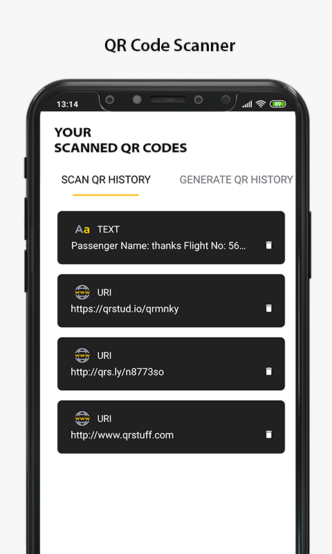 - Maintain history of Scanned & Generated QR codes for quick use of that QR code.