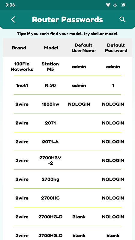 Bukti Kelayakan Lalai Penghala: Akses senarai lengkap nama pengguna dan kata laluan lalai untuk pelbagai model penghala, lengkap dengan fungsi carian.