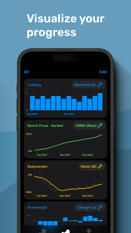 Optimumkan latihan kekuatan anda dengan graf dan cerapan kami. Visualisasikan sejarah program senaman anda dan analisis cara pembinaan otot dan latihan kekuatan anda telah berkembang dari semasa ke semasa terima kasih kepada penjejak gim.