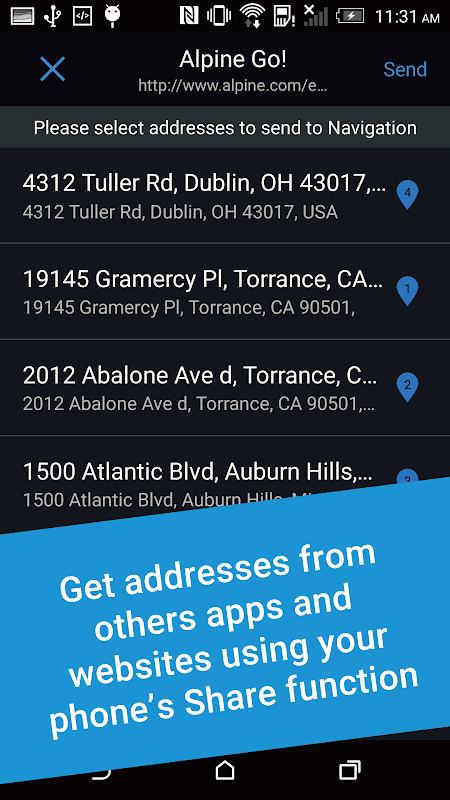 - Get place addresses from others applications and websites using Android phone's Share function.