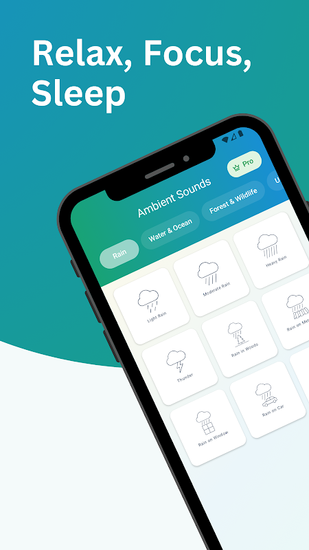 Pilih daripada kategori seperti Hujan & Angin, Air & Lautan, Hutan & Hidupan Liar dan Bandar & Dalaman untuk mencipta suasana yang sempurna — sama ada anda ingin berehat, belajar, bermeditasi atau hanyut tidur.