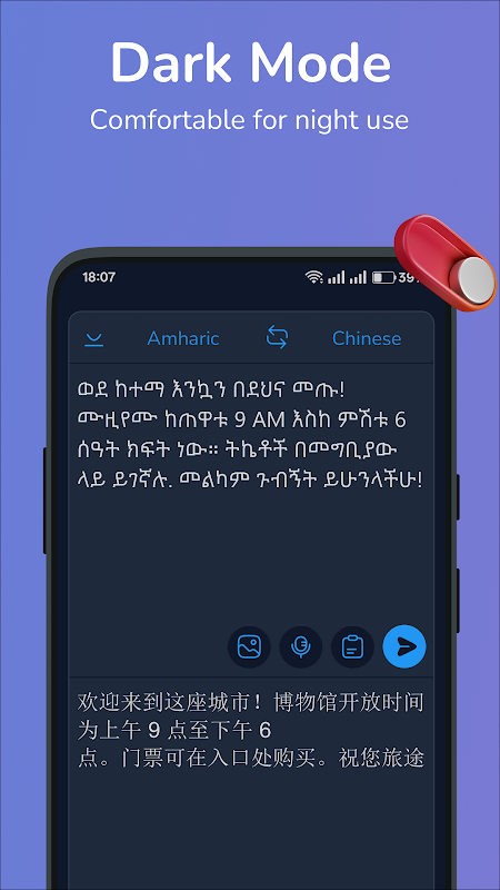 - Pengecaman pertuturan semula jadi: Hanya bercakap secara semula jadi dan dapatkan terjemahan yang sempurna ke dalam Bahasa Cina Mudah atau Amharik