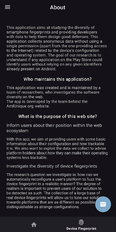 Aplikasi ini bertujuan untuk mengkaji kepelbagaian cap jari telefon pintar dan menyediakan pembangun dengan data untuk membantu mereka mereka bentuk pertahanan yang baik. Aplikasi ini mengumpul cap jari telefon pintar tanpa nama tanpa menggunakan satu kebenaran (selain daripada yang menyediakan akses kepada Internet) yang berkaitan dengan konfigurasi peranti dan sistem pengendalian. Matlamat penyelidikan kami adalah untuk memahami sama ada mana-mana aplikasi di Gedung Play boleh mengenal pasti pengguna tanpa bergantung pada pengecam tertentu yang sudah ada pada Android.