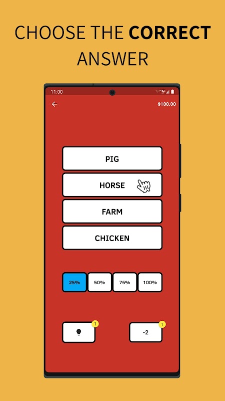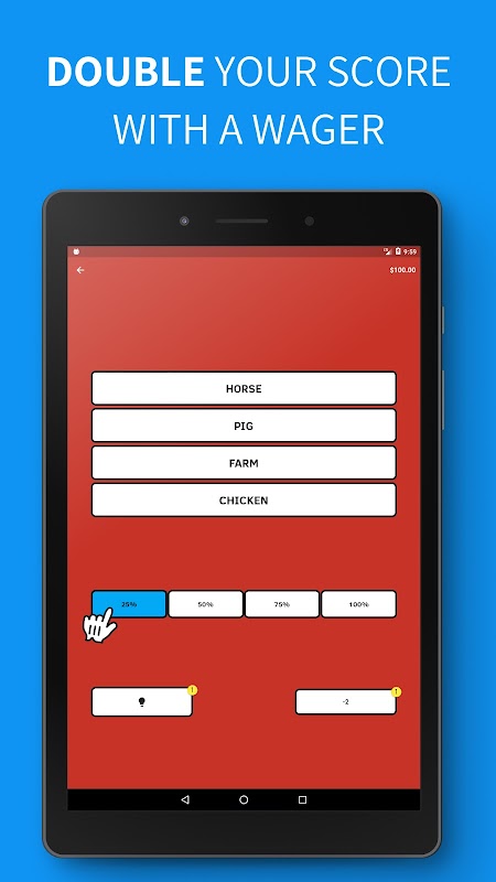 Anda boleh menggunakan pembayang, atau memadam 2 pilihan untuk memudahkannya. Gandakan skor anda dengan memilih 100% setiap kali atau berisiko kehilangan segala-galanya.