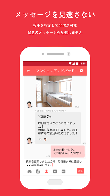 Ini adalah aplikasi sembang yang membolehkan anda bertukar komunikasi dengan mudah di tapak pembinaan, yang cenderung rumit dengan analog seperti telefon, faks, dan e-mel, dengan telefon pintar anda.