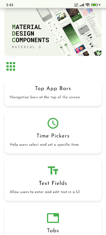 Misi kami adalah untuk memberi rujukan kepada pembangun android untuk pelaksanaan berdasarkan Garis Panduan Reka Bentuk dari tapak reka bentuk Bahan rasmi.