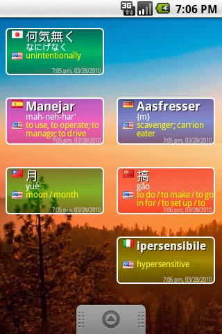 * 2x1 widget (long-press on Android device to select from widget menu) to display words of chosen languages with English description
