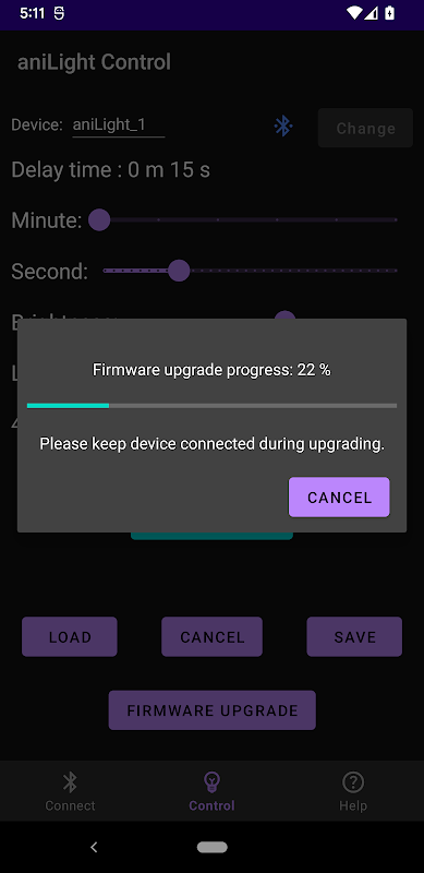 Gunakan aniControl untuk mengawal produk aniLight v1 anda melalui Bluetooth Tenaga Rendah (BLE), termasuk menukar tetapan peranti (seperti Kecerahan cahaya, warna cahaya RGB, suhu warna Putih, Masa Tunda, dsb.) dan melakukan Over-the-Air (OTA) kemas kini perisian tegar untuk memastikan peranti anda dikemas kini.