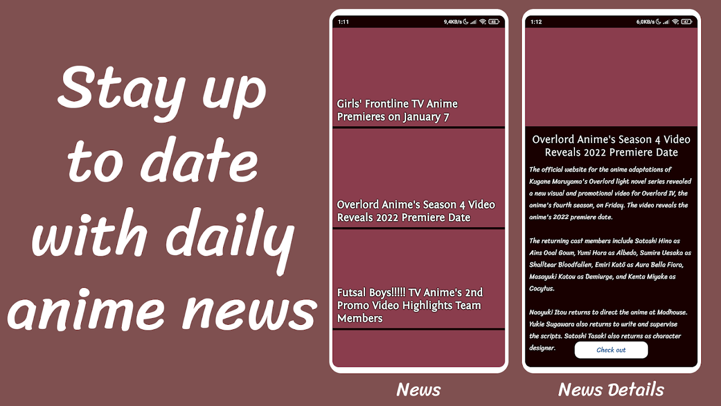 The latest anime news are uploaded to the app daily. If you activate notifications for news, you will receive notifications for every news added to the application.