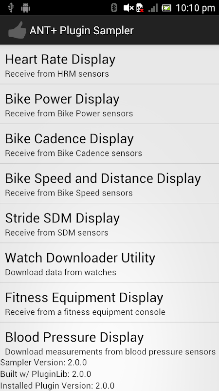Yang ANT + Plugin Sampler membolehkan interaksi dengan semua peranti ANT + disokong oleh ANT + yang Plugins. Ia bertujuan sebagai alat ujian dan kod rujukan, sehingga tidak amat cukup dan tidak akan menjadi sangat bagus untuk digunakan untuk kegunaan am. Kod sumber boleh didapati di ANT kami + Android SDK pada http://www.thisisant.com/developer/ant/ant dalam android/.