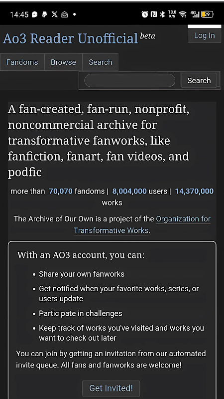 ✔ Penyemakan Imbas AO3 yang lancar – Cari, semak imbas dan baca fiksyen kegemaran anda dengan mudah.