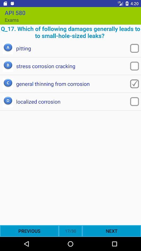 This Free version has 16 practice and 15 exam questions to show you the general view of the app. The full Exams version includes more than 600 questions that cover the whole sections of API 580 Examination