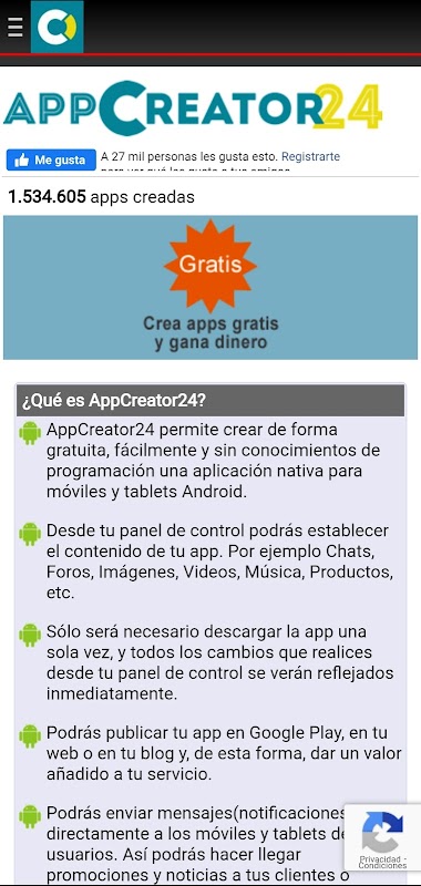 AppCreator24 membolehkan anda membuat aplikasi asli untuk telefon bimbit dan tablet Android secara percuma, mudah dan tanpa pengetahuan pengaturcaraan. Dari panel kawalan anda boleh menetapkan kandungan aplikasi anda. Contohnya Sembang, Forum, Imej, Video, Muzik, Produk, dll.