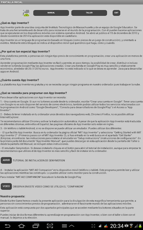 Yang kedua diakses Bengkel Youtube terdiri daripada lapan video dan untuk memuat turun manual dalam format PDF. Bengkel ini adalah bangunan, langkah demi langkah, apa-apa angkasa permohonan dari awal hingga akhir, terima kasih kepada permainan ini mudah diperkenalkan secara beransur-ansur, asas-asas pengaturcaraan.