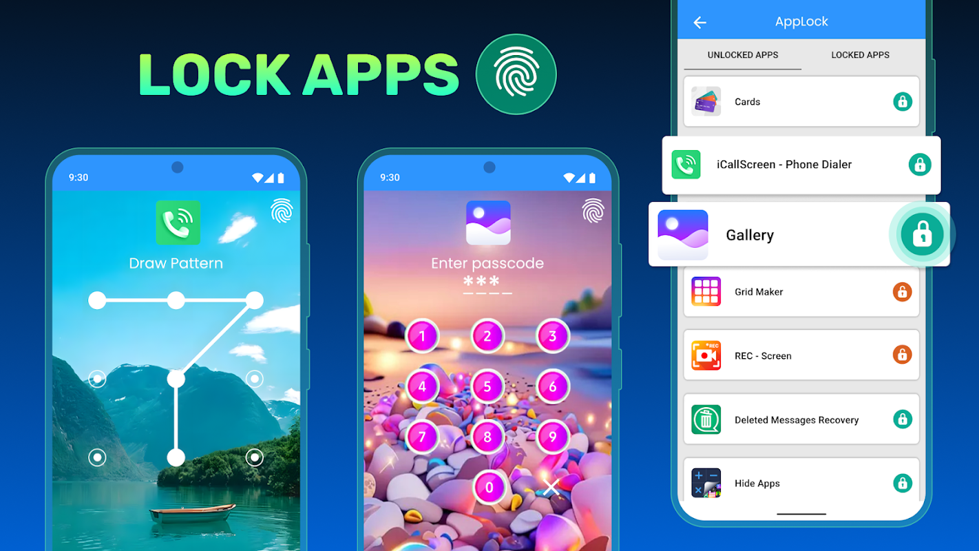 Aplikasi sistem kunci seperti kunci gmail, kunci galeri, tetapan, kenalan, mesej, kunci sembang, dan semua aplikasi telefon lain dengan satu ciri kunci aplikasi sentuh.