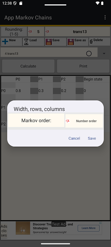 Mana-mana nama Matriks transaksi dan namanya dipaparkan dalam senarai juntai bawah, apabila memilih Matriks transaksi senarai kandungannya dipaparkan dalam jadual dan butang muncul Kira, yang melaluinya dikira vektor keadaan x(k). Dalam Tekan butang Kira dalam dialog masukkan k, nombor bagi vektor yang dikira bagi keadaan x(k). Lampiran Ia juga mempunyai fungsi untuk memformat dalam fail ( bernama AppMarkovChains.txt) untuk mencetak pada paparan Matriks transaksi atau Vektor yang ditunjukkan keadaan x(k). Fail Berformat boleh disimpan dalam Direktori fail peranti, iaitu sebagai struktur seperti pokok. Dalam pilihan Folder muncul butang storan hijau, Dengan menekan dipilih oleh dia daripada dialog sama ada untuk melaksanakan Storan