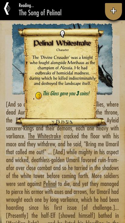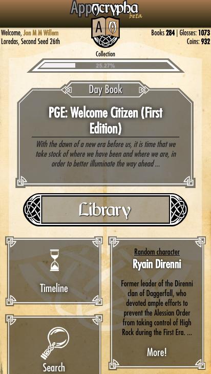 La App es, al mismo tiempo, una biblioteca, un coleccionable, una wiki, una pequeña red social, y un laberinto de conocimiento, razón de su nombre, pues Apocrypha es el reino del Príncipe Daedra Hermaus Mora, Señor del conocimiento velado. Y ha perdido las Glosas Negras, que son las que atesoran los pergaminos, escondidas tras los nombres de los libros. Al tapear los nombres para hallar monedas, encontrarás su pergamino. Ese pergamino no es uno de los antiguos, pero te dan acceso a ese conocimiento que has pulsado. Hay miles de pergaminos escondidos: 5000 ni más ni menos, y aún faltan por añadir unos 3000 más. Pueden parecer simples enlaces, pero no, porque con ellos coleccionas y completas tu pequeño album/wiki personal.