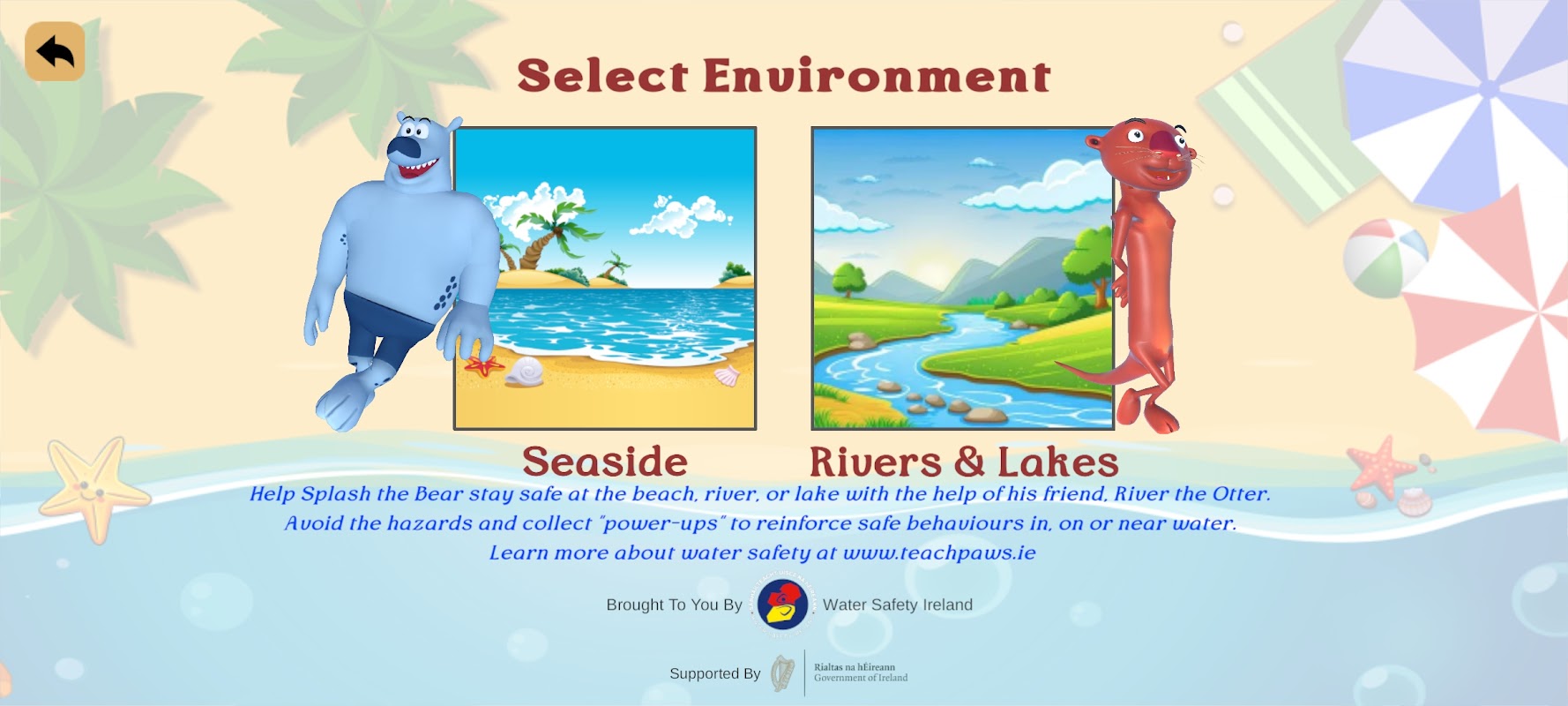 Jika Splash menghadapi kesukaran, kawannya yang bijak 'Sungai', memerang mengingatkannya melalui soalan tentang 'amalan keselamatan terbaik' untuk berenang selamat di luar, dengan jawapan yang betul diperlukan untuk Pemain meneruskan perjalanan mereka.