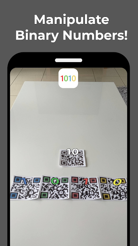 This app uses image recognition and tracking to allow you to move round and play with 4 bit binary numbers. Each bit uses a unique QR code found in the following Google Drive link!