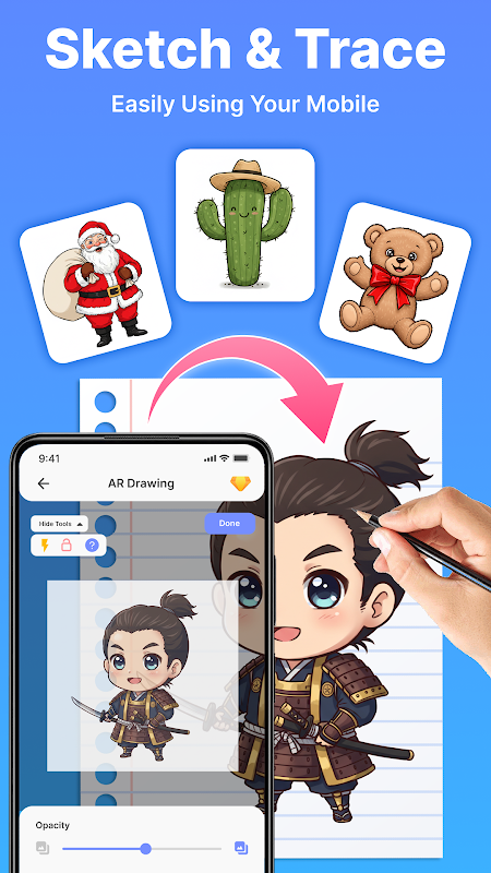 Sama ada anda menggunakannya sebagai apl lakaran, apl jejak dan lukis atau alat pengesanan umum, Lukisan AR menawarkan pengalaman kreatif yang lancar. Hebat untuk penggemar, pelajar atau profesional. Sesuai untuk mengesan anime, logo, watak atau mencipta seni asli.