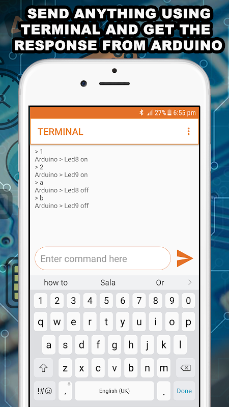 Jalankan aplikasi, cari modul bluetooth dan sambungkannya. Sebaik sahaja anda disambungkan, anda akan dapat menghantar arahan anda sendiri ke papan Arduino anda menggunakan papan kekunci atau beberapa butang mewah