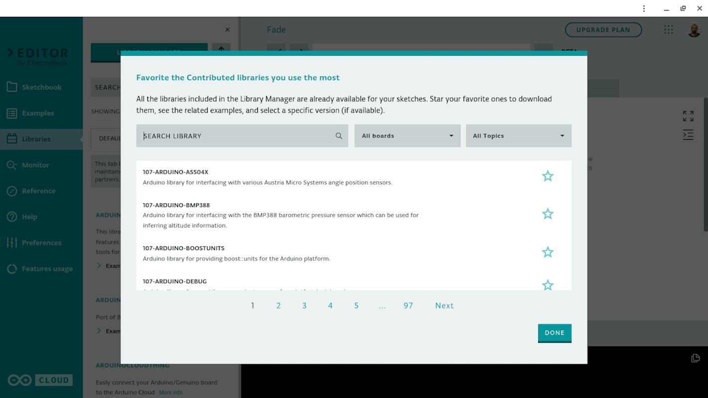 Dibina untuk Chromebook. Kod dalam talian, simpan lakaran anda dalam awan dan muat naiknya ke papan Arduino yang disambungkan ke peranti anda.
