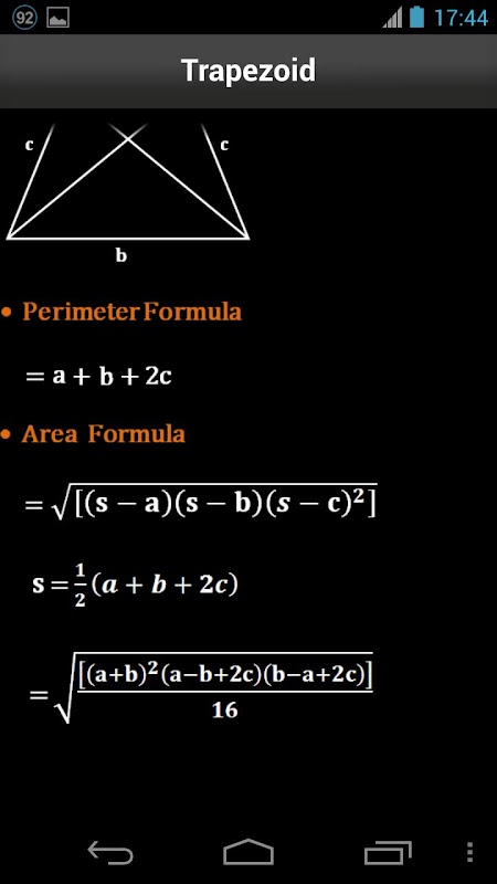App showcases perimeter and area formulas for 2D objects, and surface area & volume formulas for 3D objects.