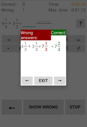At the end the wrong sums are shown with the correct and incorrect answers.