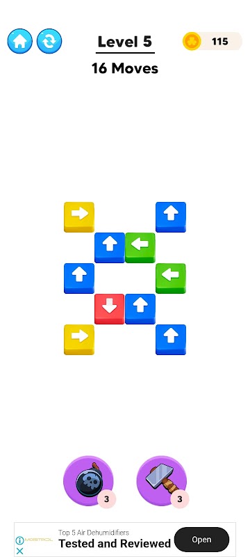 Halangan Unik: Navigasi teleporter, lengan berputar, blok gelongsor dan pintu bermasa untuk mengosongkan anak panah dalam urutan yang betul.