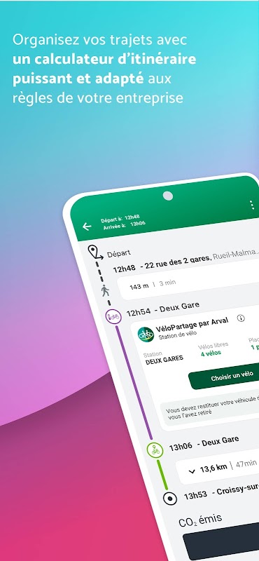 Aplikasi Arval Mobility mempermudah pilihan mereka di antara berbagai mod pengangkutan, sama ada ditawarkan oleh syarikat mereka (perkongsian kereta atau basikal oleh Arval, carpooling) atau peribadi (kereta, basikal, pengangkutan awam, dll.), Dan apa sahaja perjalanan mereka (**)