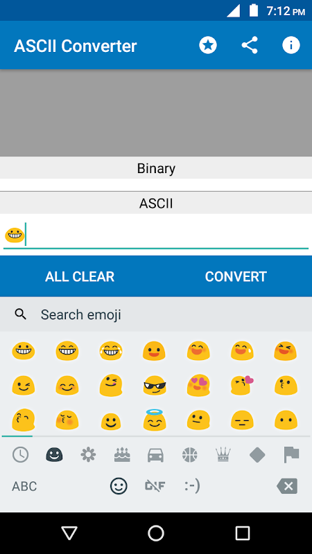 Converts ASCII characters to Binary, Hex, Octal and Decimal representations including emojis and pictures. In some mobiles emoji keyboard is visible after 'long press' on 'new line' button.