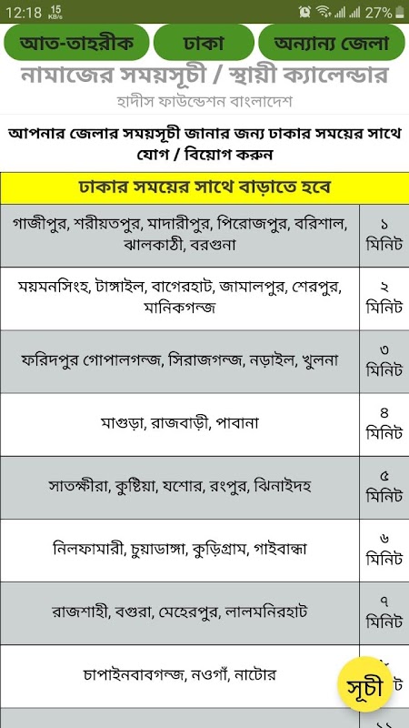 এই এপের মাধ্যমে সকল জেলার নামাজের স্থায়ী সময়সূচী দেখতে পারবেন। এখানে ঢাকার জন্য সরাসরি সময় দেওয়া আছে, এবং বাকী জেলাগুলো দেখার জন্য কিছু সময় যোগ অথবা বিয়োগ করলেই হবে। যে সময়টুকু যোগ বিয়োগ করতে হবে তা এপটিতে দেওয়া আছে। "অন্যান্য জেলা" বাটনে টাচ করলেই দেখা যাবে।