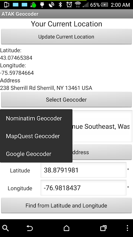 Shows current location in Latitude and Longitude and Street Address with the Ability to Request a refresh for the information on the fly.