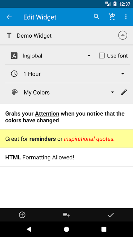 Widget App skrin utama yang unik widget! Apabila anda meletakkan Nota pada skrin anda dengan aplikasi ini nota skrin secara automatik mengubah warna secara berkala! Nota skrin dan peringatan akan sentiasa menarik perhatian anda.
