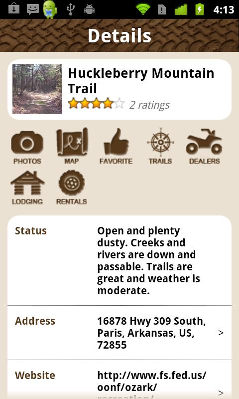 • Trail information including terrain, amenities, vehicles, difficulty, contact info, photos, and descriptions of each.