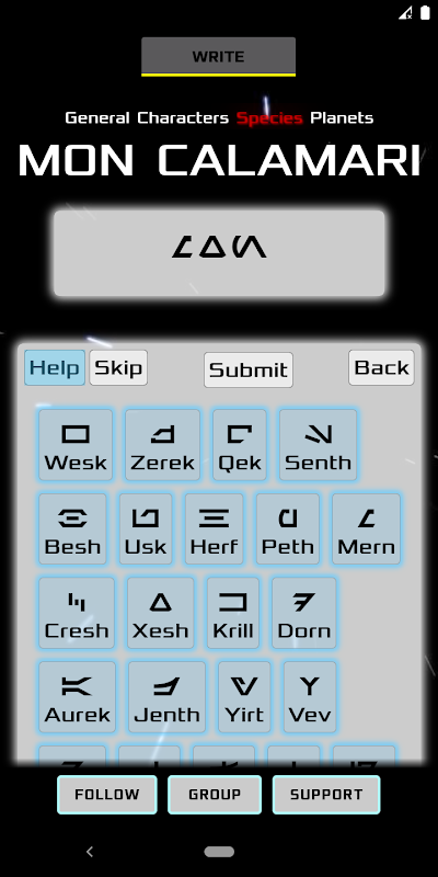 Terdapat beberapa kategori perkataan untuk dipilih, dengan perkataan dan nama daripada pelbagai topik seperti watak, planet, pejuang bintang, Clone Wars, Mandalorian, LEGO, SW Kenobi, Rebels dan banyak lagi. Menampilkan perkataan daripada prekuel, trilogi asal, sekuel, siri TV, buku, komik, permainan video, Legends dan Canon.