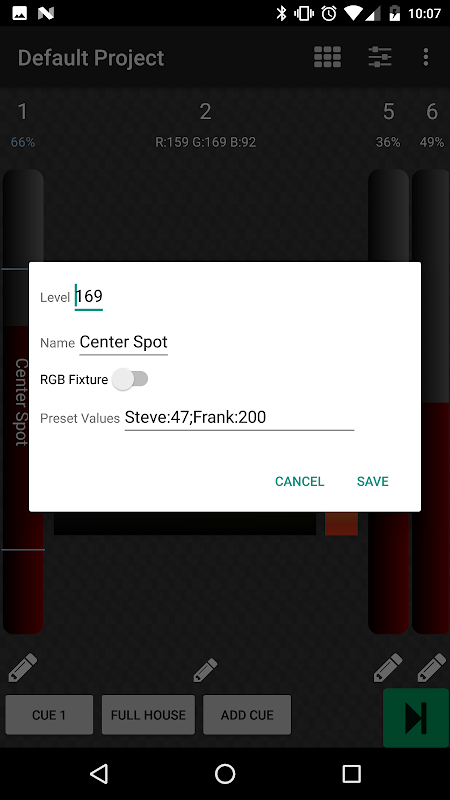 Skrin utama direka untuk memberikan pengendali papan cahaya yang sama kepada apa yang dihasilkan oleh panel saiz penuh. Ia mengandungi saluran dengan nombor saluran, tahap dalam peratus, slider peringkat, dan butang edit. Di bahagian bawah adalah senarai kiu. Tambah Cue akan membuat isyarat cahaya tahap saluran semasa dan menambahkannya ke akhir senarai kiu. Sekiranya penggunaan lama menekan pada isyarat sedia ada, mereka dapat mengeditnya. Edit ciri memasukkan isyarat baru, mengalih keluar isyarat, menamakan semula isyarat, dan mengubah masa-masa memancarkan ke bawah dan ke bawah. Dalam menu tetapan, pelayan ArtNet dipilih daripada senarai nod yang dijumpai dan kemasukan manual dibenarkan. Masa lalai isyarat lalai boleh ditugaskan bersama dengan warna saluran faders. Saluran ke penampalan dimmer dibenarkan dalam paparan patch. Satu saluran boleh diberikan kepada seberapa banyak dimmer yang anda mahu.