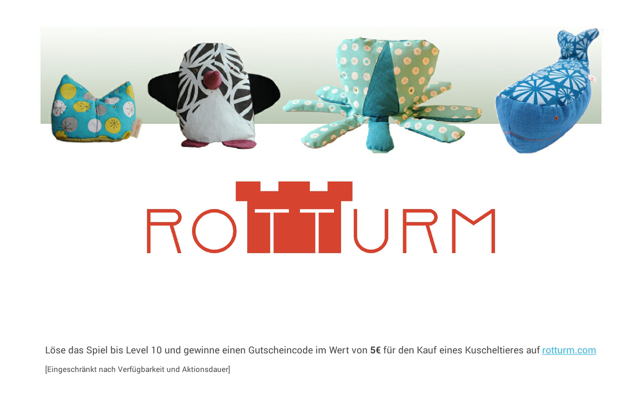 Oben befinden sich Tasten für die Hilfe (unter Punktabzug), Sound an/aus, Level zurückspringen, Aufgabe zurückspringen und Gutscheincodeinformation.