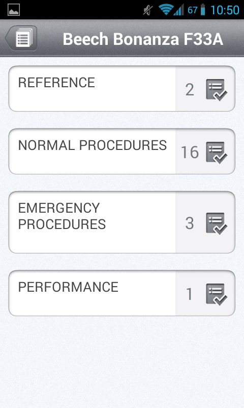 Aplikasi Senarai Semak Penerbangan untuk juruterbang. Senarai Semak dianjurkan dalam empat peringkat.