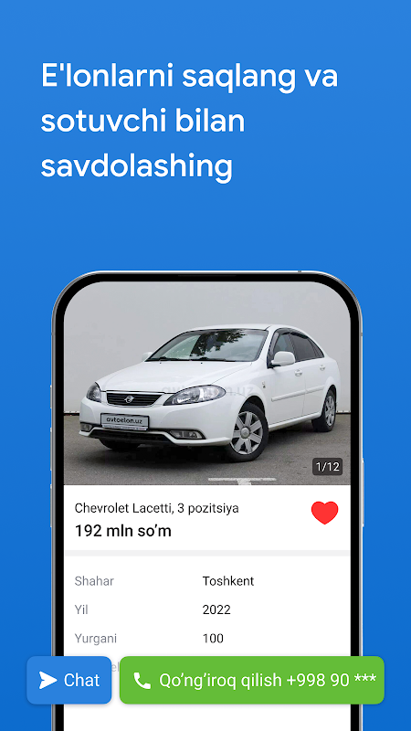 Qidiruvingizni saqlang va qidirayotgan mashinalaringiz bo’yicha yangi e’lonlar haqida xabar oling. Bu funksiya sizga sotuvchi bilan birinchilardan bo'lib bog'lanishga va qulay narxda mashina sotib olishga yordam berradi.