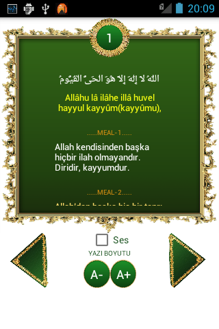 Apabila anda menghidupkan antara ayat-ayat anda memilih pilihan audio terletak di bahagian bawah skrin untuk membaca ayat-ayat yang berkaitan dengan kuat. Jika anda ingin ayat-ayat menyentuh ditulis dalam bahasa Arab atau Turki, anda mahu selagi anda boleh mendengar ayat-ayat.