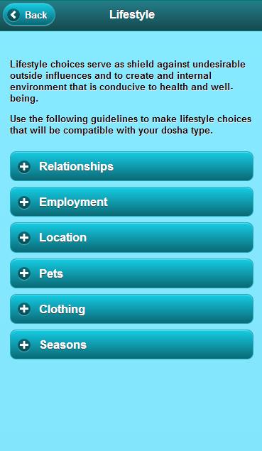 • gaya hidup Ayurvedic dan cadangan rutin pada topik-topik berikut: Timbul, Mandi, Meditasi, Perkhidmatan Urutan, Latihan, Makan, Seks, Sleep, Pakaian, Pekerjaan, Pasangan, Lokasi