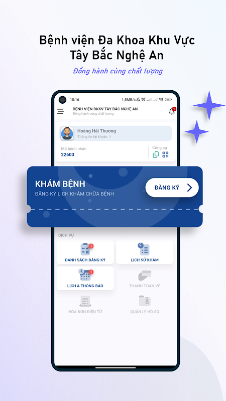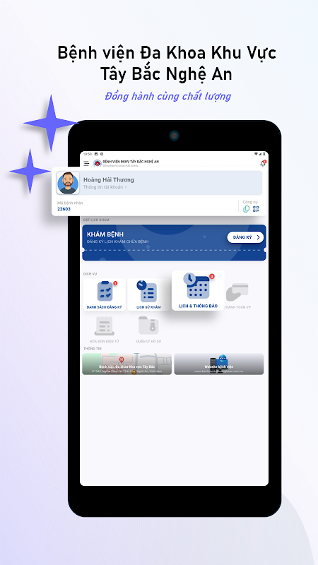 Aplikasi yang dikaitkan dengan Hospital Besar Serantau Northwestern Nghe An untuk menyokong pelanggan mendaftar temu janji peperiksaan dengan cepat, mencari maklumat keputusan diagnostik dan paraklinikal dengan mudah dan selamat.
