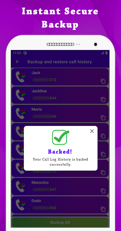 Pulihkan apl sejarah log panggilan dengan lancar menyandarkan sejarah log panggilan anda untuk memastikan anda tidak kehilangan rekod penting lagi. Dengan hanya satu klik, anda boleh membuat sandaran selamat untuk semua log panggilan anda, menghalang sebarang pemadaman yang tidak disengajakan daripada menyebabkan kehilangan data yang tidak dapat dipulihkan.