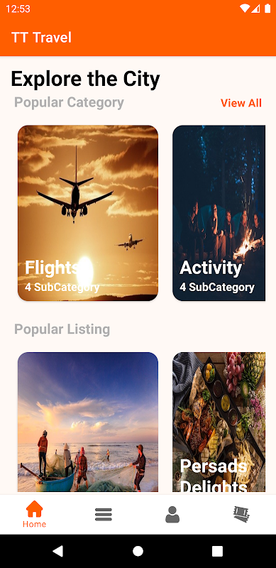 Dalam aplikasi ini anda dapat mencari: Tentang Kami, Penerbangan, Aktiviti, Facebook, Hotel, villa.