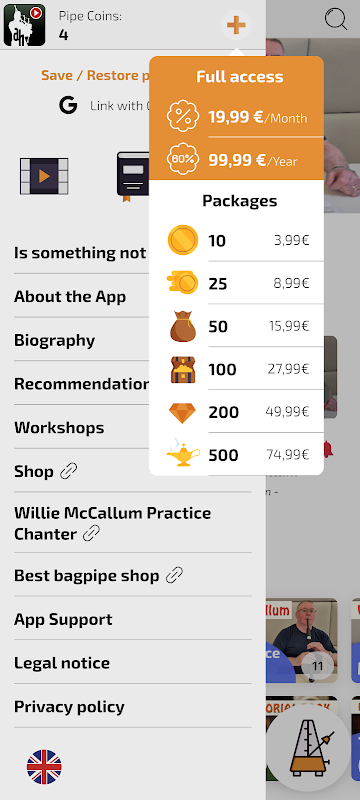Bagpipe-Tutorial-App ini ialah rujukan multimedia paling komprehensif di dunia tentang memainkan bagpipe Scotland. Ia mengandungi lebih daripada 700 video yang menunjukkan kawalan instrumen dan teknik jari, termasuk maklumat audio-visual pada semua nota dan hiasan. Banyak latihan menyampaikan keperluan paip Scotland.