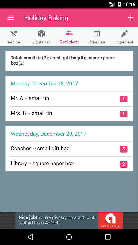 *Adding recipients of goodies and assigning containers to them. You can also set a date for when recipient will receive your treats.