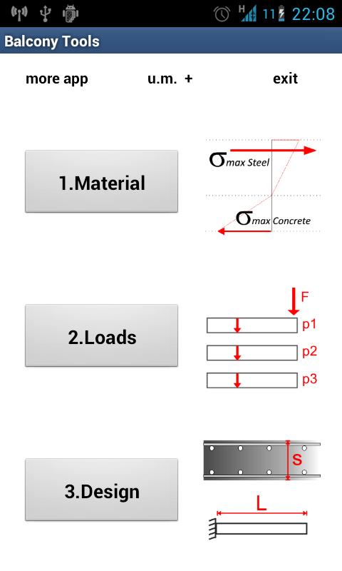 Permohonan yang berguna untuk Arkitek dan Jurutera. Reka bentuk bahagian struktural balkoni dalam 3 langkah. Berguna untuk anggaran papak julur sebelum jumlah pengiraan daripada struktur lebih kompleks.