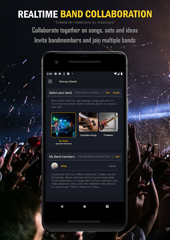 Anda boleh menguruskan berbilang band dan sudah tentu koleksi peribadi anda sendiri. Jemput ahli kumpulan untuk menyertai dan bekerjasama. Perubahan yang dibuat pada lagu dan senarai set tersedia dengan segera dan lancar kepada semua ahli yang merupakan sebahagian daripada kumpulan anda. Tiada lagi kehilangan nota atau salah komunikasi. Semua orang bekerja dari halaman yang sama!